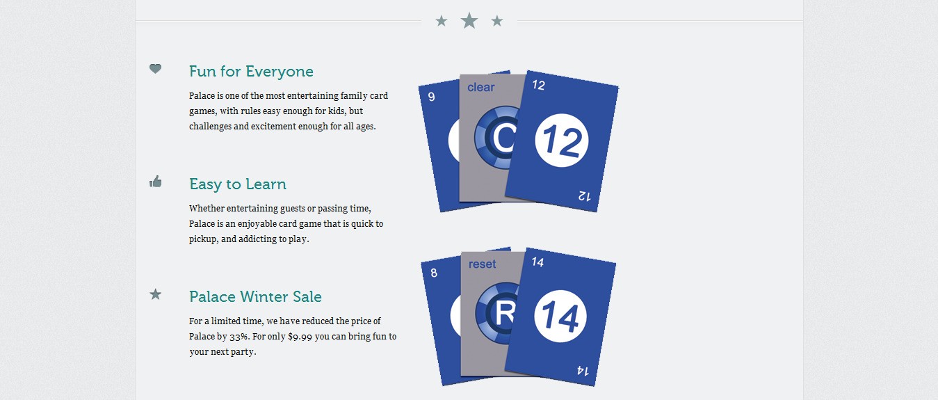 The basic idea of Palace is to be the first person to get rid of all of your cards. Play cards in a discard pile using ascending order and the first player to run out of cards wins. If he has two or three of the same rank he may play all such cards.